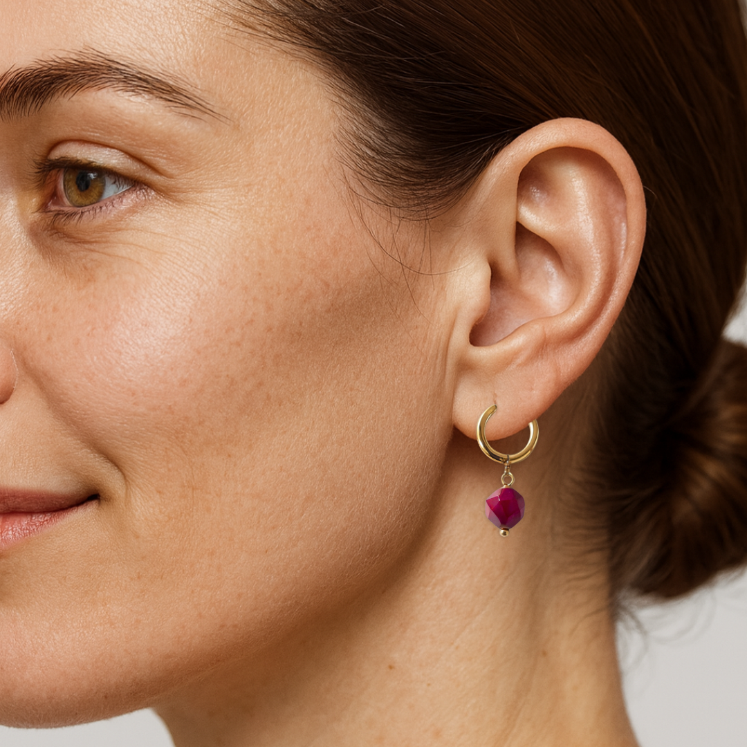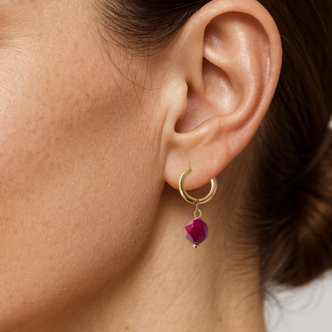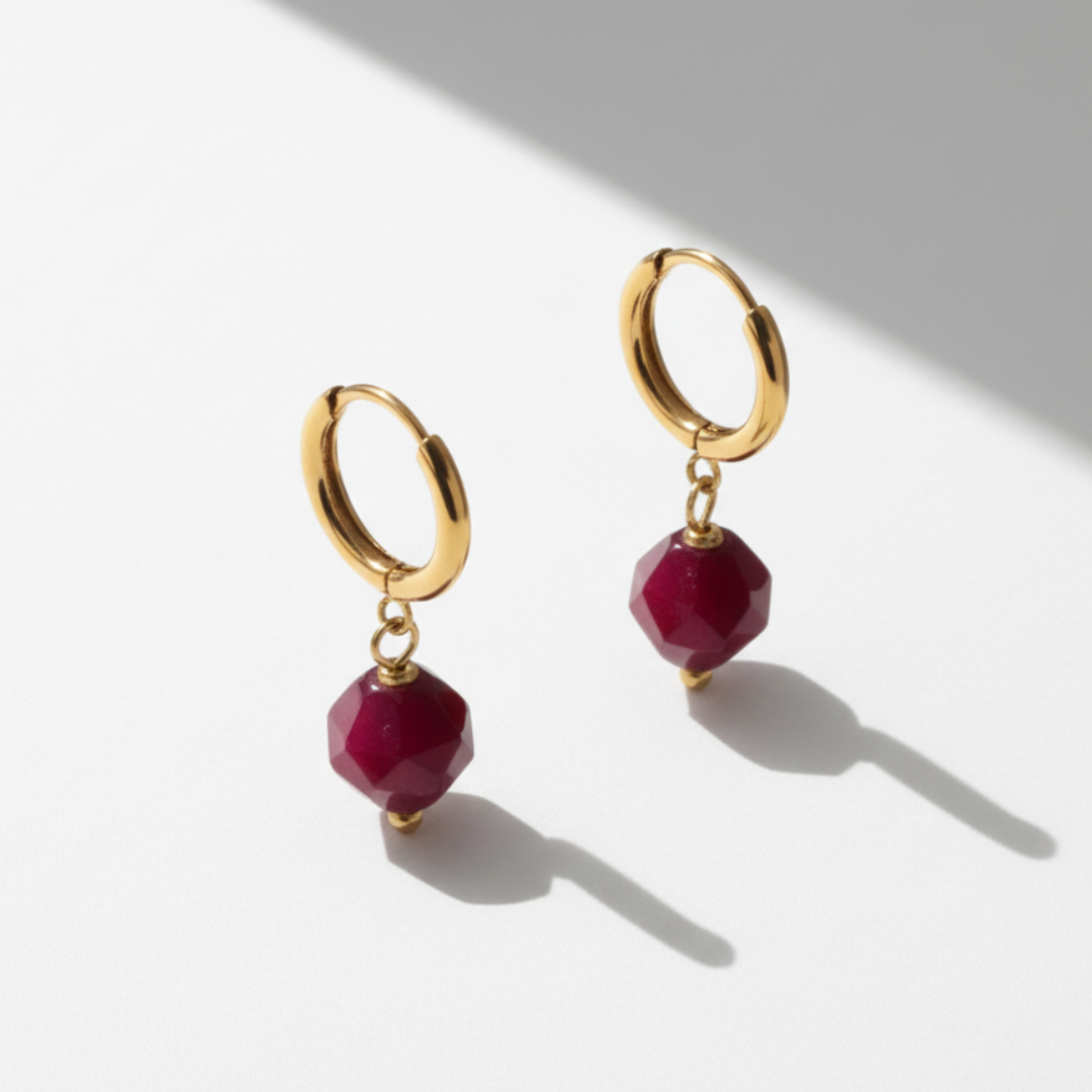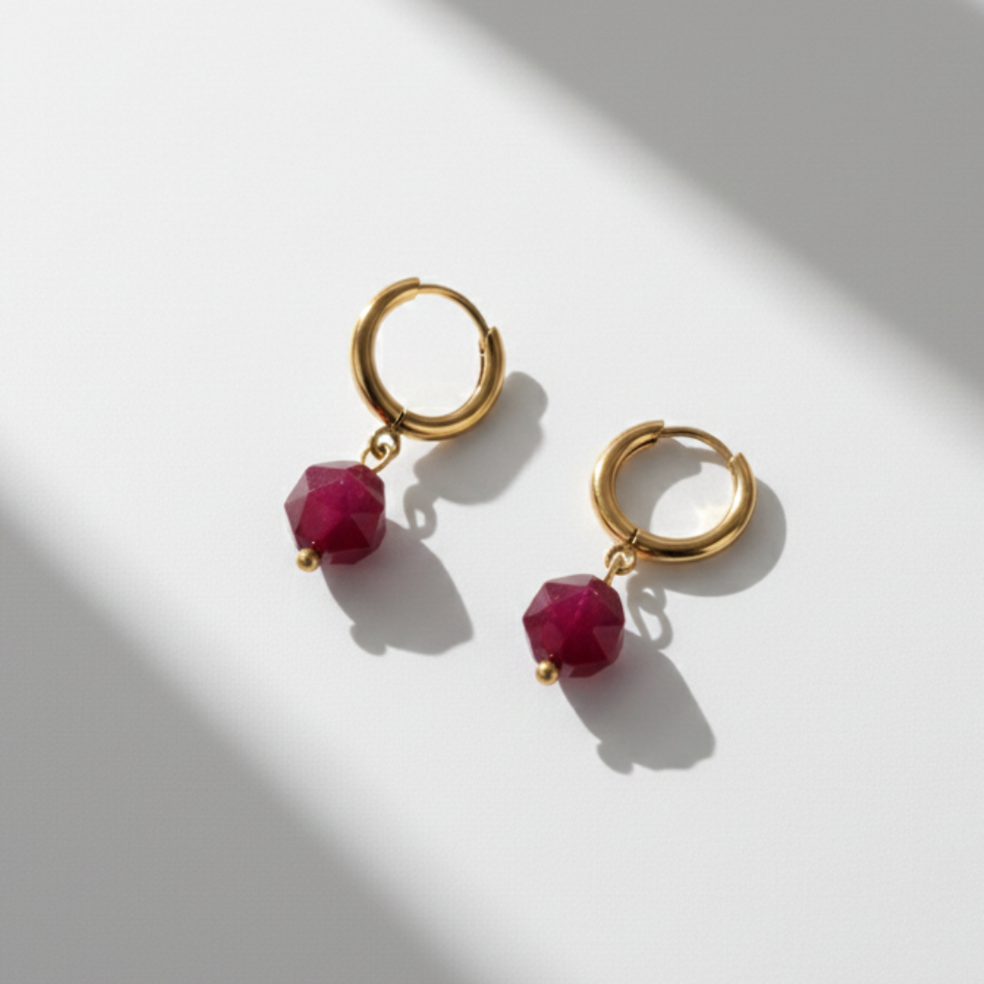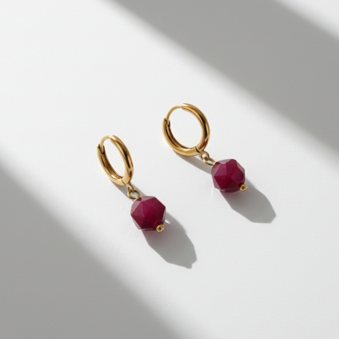 Una piedra facetada en un rojo profundo cuelga delicadamente de un aro dorado, creando un contraste moderno y llamativo que ilumina cualquier look.