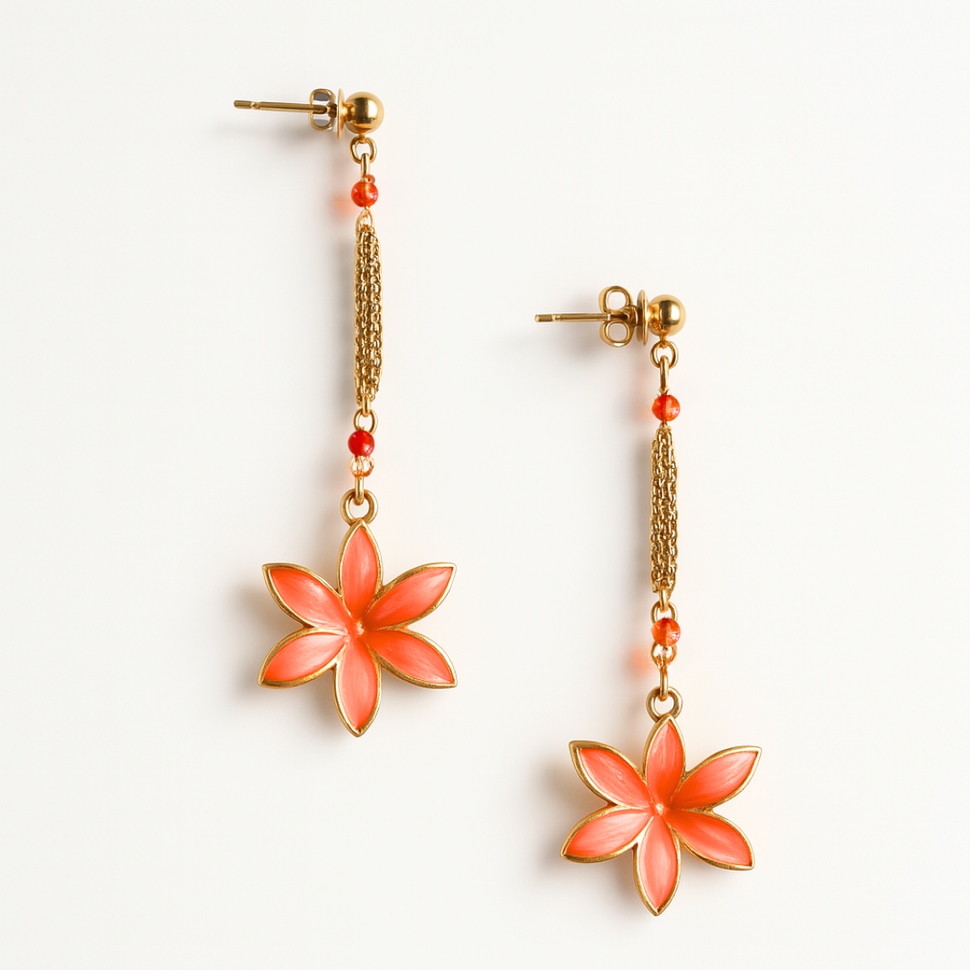 - Diseño: Flor coral esmaltada, colgante con cadena dorada.