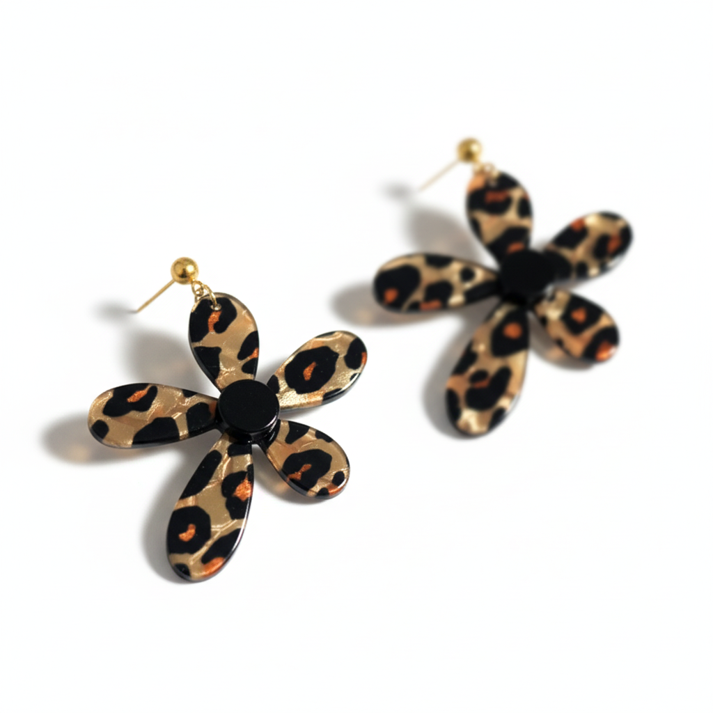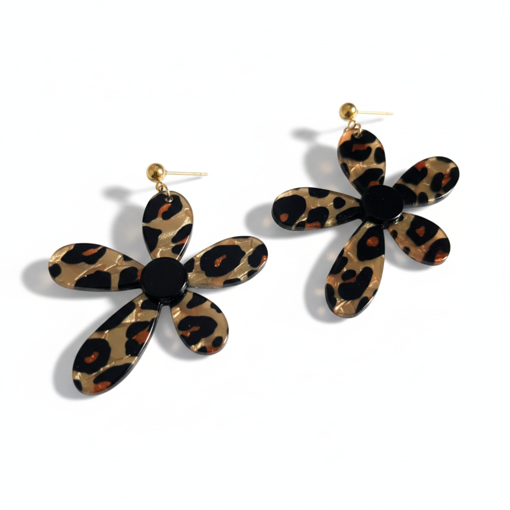 Los pendientes Kora combinan el encanto retro de una flor XL con un estampado animal print en resina brillante que aporta carácter y estilo. Son ligeros, llamativos y perfectos para elevar cualquier look con un toque atrevido y muy actual.