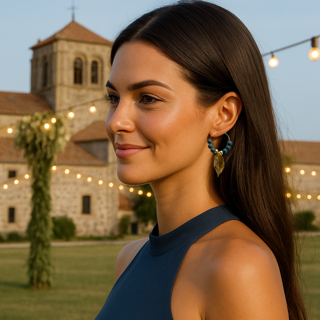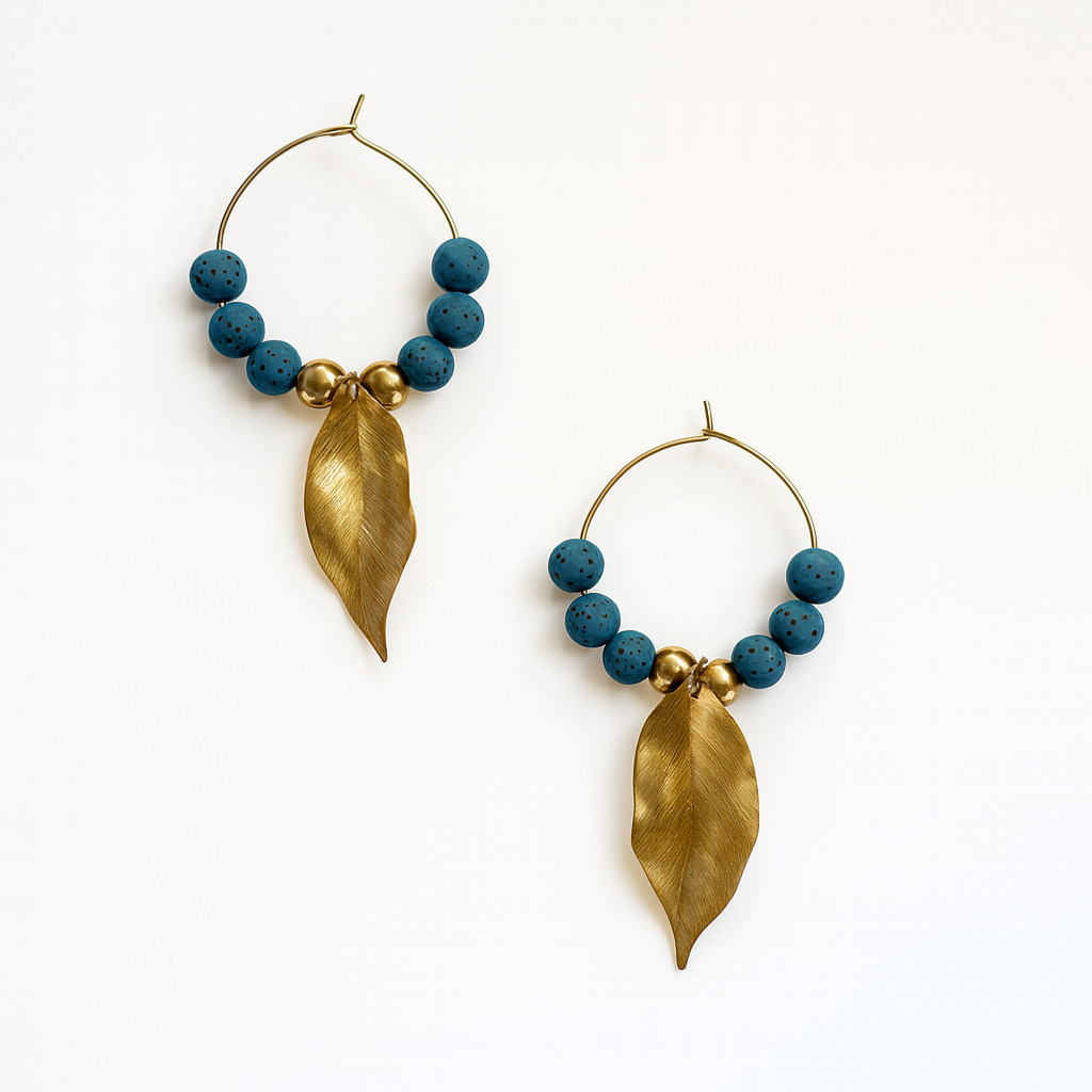 Los pendientes Mia son una mezcla perfecta entre fuerza natural y elegancia contemporánea. Su diseño combina piedras volcánicas azul petróleo con una hoja dorada texturizada en acero inoxidable que cuelga con gracia.