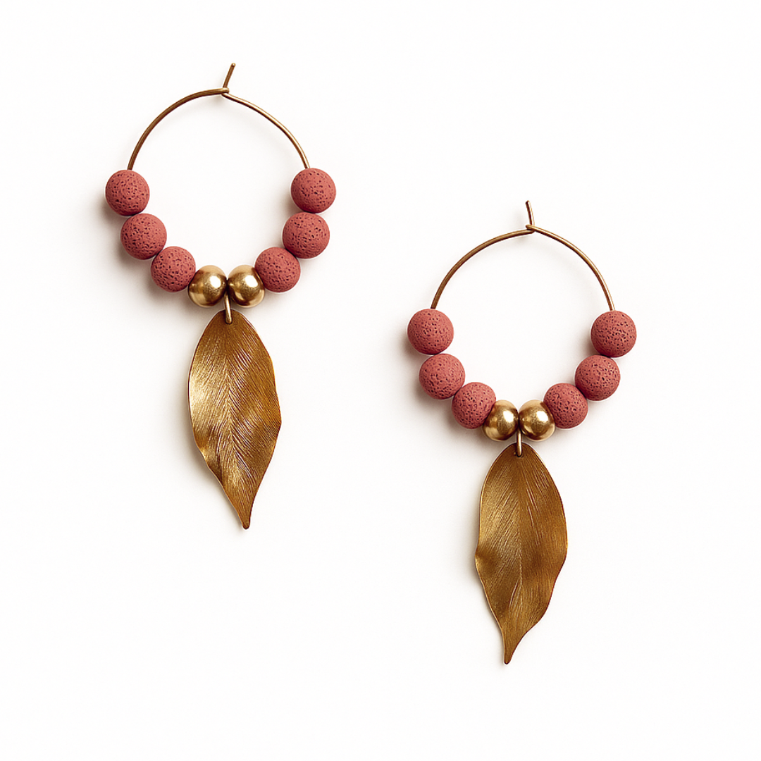 - Diseño: Aros con piedras volcánicas y hoja dorada
